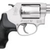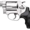 Smith & Wesson’s 637 1.875 inches .38 Stainless/Aluminum revolver is known for its compact size, lightweight, reliability, and superb performance. This J-frame Smith and Wesson have been very popular as a personal defense weapon for many years. It comes with an exposed hammer and offers a 5-round bullet capacity. The gun’s design features fixed-notch rear sight, integral front sight, and black rubber grips for better handling while shooting. With an aluminum alloy frame and stainless steel cylinder, this revolver is an extremely light-weight single/double action gun.